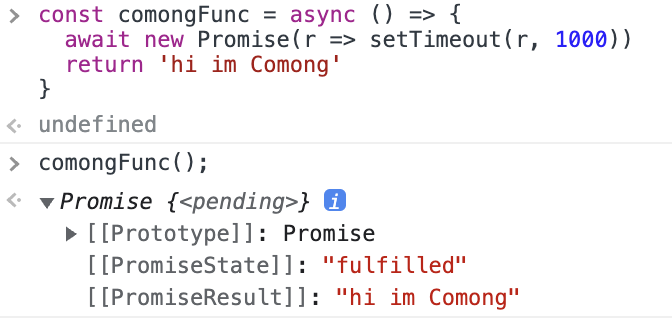 Promiser객체가 뜬다. 결국 결과값으로는 return값이 아닌 프로미스 객체를 리턴한다.
