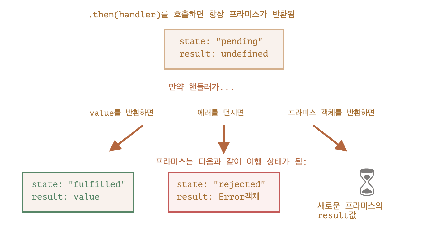 프라미스 체이닝이 가능한 이유는 promise.then을 호출하면 프라미스가 반환되기 때문이다. 반환된 프라미스엔 당연히 .then을 호출할 수 있다.한편 핸들러가 값을 반환할 때엔 이 값이 프라미스의 result가 됩니다. 따라서 다음 .then은 이 값을 이용해 호출된다.