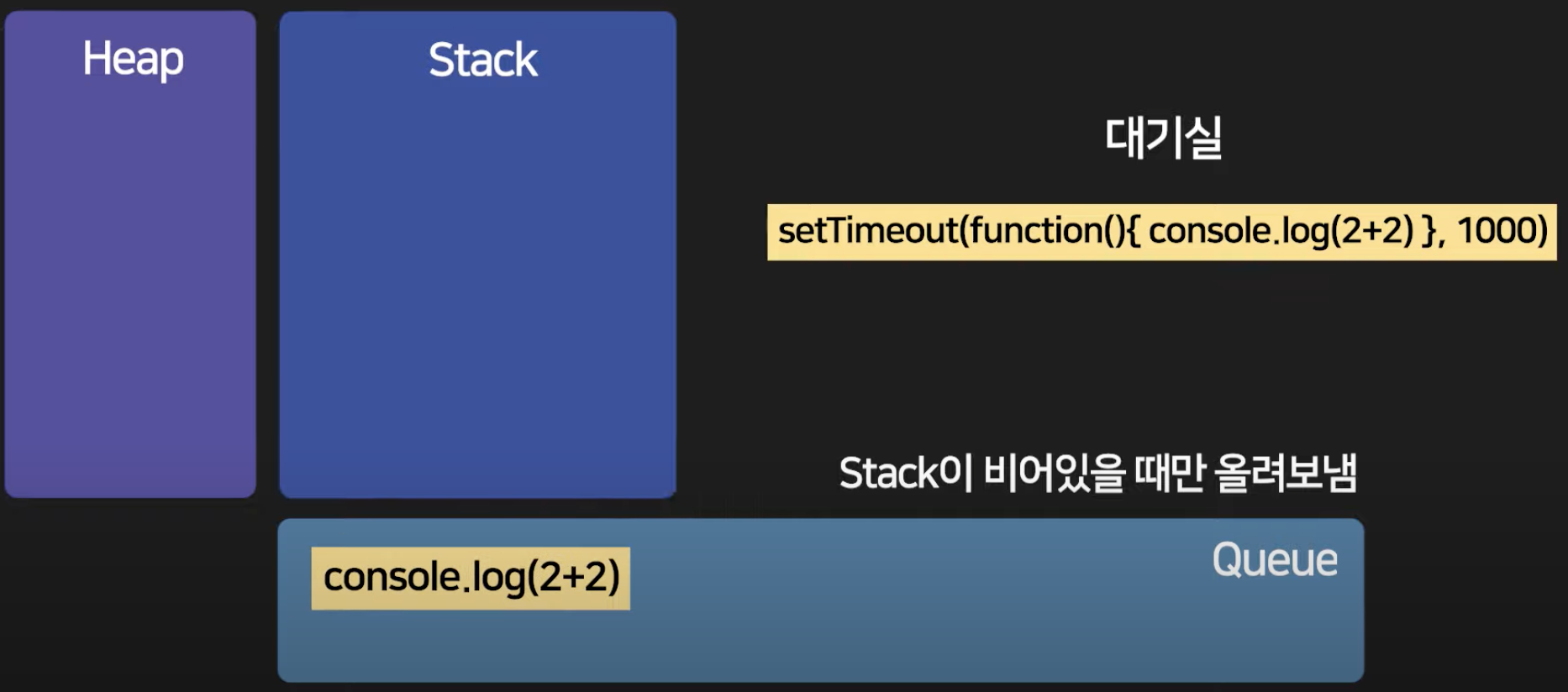 자바스크립트 어려운 연산을 시키면. 그다음에 이벤트는 대기실로가버리고 스택이 비워질때까지 계속기다린다.